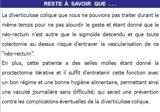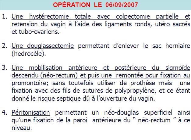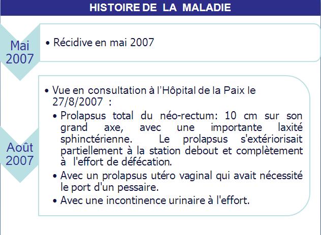 Dernière nouvelle en mai 2009 : Elle va très bien et sans récidive avec de bons résultats fonctionnels anal, génital et urinaire.