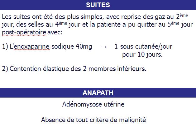 Le temps nécessaire que l'anti vit K (Acénocoumarol 4mg) ¾ cp/j devient efficace (confirmation biologique → TP, TCK), ce qui a permis la disparition de la symptomatologie en 2 semaines.